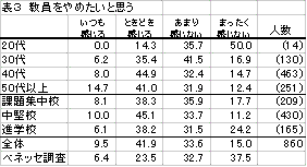 そのような中での調査であったが、結果を見ると、体力的・精神的に苦労は多いものの、「生徒と接する喜びのある仕事」ととらえる教員も多く、生徒とのふれあいは、教員という職業や教育を考える上で欠かせないものだととらえられる。他方で、教員志望時の情熱をともすれば見失いそうになる教員の姿も見える。「教員をやめたいと思う」と答えた者が相当数あるということは、当該者の個性や資質の問題ではなく、現在の学校のあり方という広い視点で考えるべき課題である。