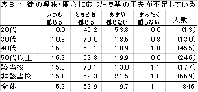 「どちらともいえない」が37.6%で、具体的な評価の仕方が不明なことなどよると想像される。全体の『賛成』は33.8%であるが、特に、20代(46.2%)、40代(38.9%)が『賛成』の傾向が高い。生徒の声を授業に生かしていきたいとする姿勢がうかがえる。