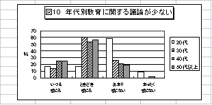 この項目に関しても「どちらともいえない」がきわめて多かった(44.4%)。私立とは違う公立学校でどのように考えるか判断しがたいものがあるのだろう。また、他の項目とやや違い、年齢が高くなるほど「どちらともいえない」が増える傾向にあった。『賛成』は、20代38.5%、30代は23.3%と若い層ほど高い傾向にある。