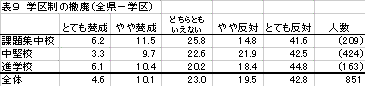 『反対』が33.6%、『賛成』が27.5%である。県内に単位制高校が少なくその実態がつかみにくいからか、「どちらともいえない」も38.9%と多く、評価が定まっていない。